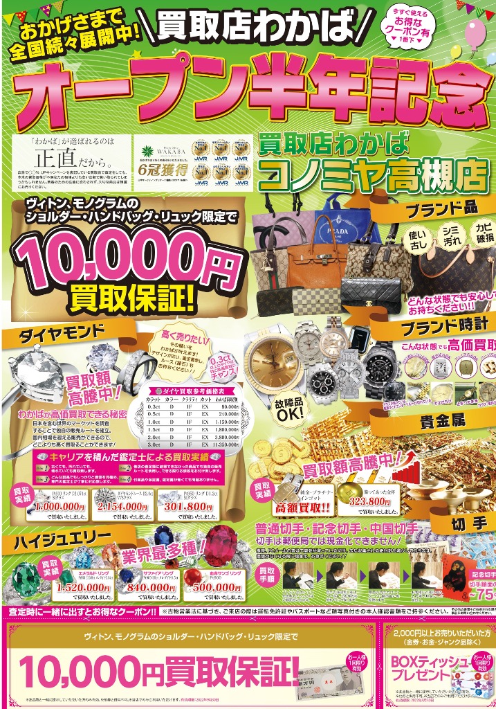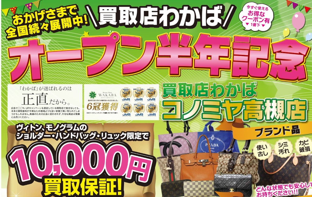 高槻市の栄町に開店して半年が過ぎました。買取店わかばコノミヤ高槻店では、オープン半年キャンペーンとして、ルイビトンの買取保証キャンペーン中です。どんなにベタベタな状態や皮の状態が悪くても、取ってが切れたようなものでも、買取保証の対象になります。もう使わないからと言って押し入れの奥にしまっている等、本当にもっいたいと思います。