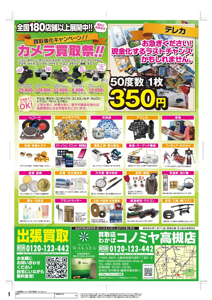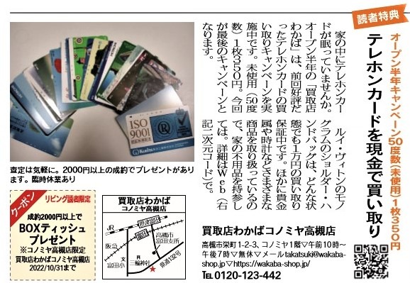 サンケイリビングで告知中ですが、高槻市の栄町にオープンして半年の買取店わかばコノミヤ高槻店では、テレフォンカードの買取キャンペーン中です。10月いっぱいになりますが、リビングを読まれていない方でも、一言言って頂いたらキャンペーンを適用させて頂きます。50度1枚350円で買取させて頂きます。是非一度ご来店頂けたらと思います。よろしくお願いいたします。