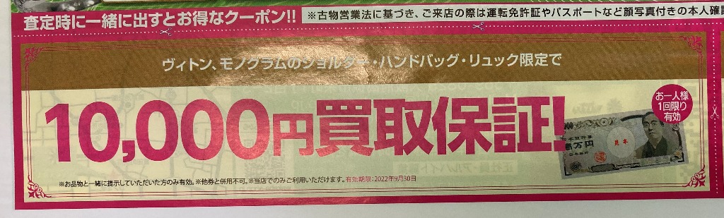 現在ルイビトンのモノグラムのショルダー・ハンドバッグ・リュックについては、使用状況に拘わらずどんな状態であっても、1万円の買取保証中です。良かったらこの機会にご利用の検討をお願い致します。